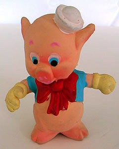 これは東京へ遊びに行った友達からのおみやげです。押すと「ピー」と音がでます。DISNEYのキャラクターですが名前はわかりません。インターネットで調べた感じでは3匹の子豚の1匹に服装が似ているのですが、Bugs Bunnyと良く一緒に出てくるPorkey Pigかもしれません。スペイン製。
