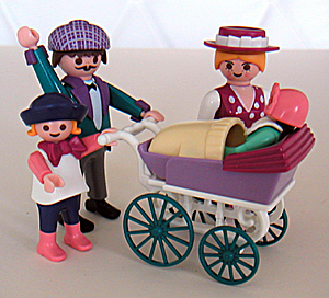 ニューヨークに行った時に5番街のおもちゃ屋さん、F.A.O. Shwartzで記念に買ったプレイモービルの英国?家族です。赤ちゃんの帽子やスタイ等ははずせます。写真には写っていませんが、お母さんの三つ編みヘアについてるブルーのリボンがチャーミング。箱入りセットで買いましたが、一つ一つ生産年が違いました。