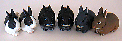 菓子メーカーフルタの製品チョコエッグのおまけ、「ペット動物コレクション第1弾」のうさぎたちです。左からダッチ2匹、ネザーランドドワーフ黒2匹、ネザーランドドワーフグレー1匹、ネザーランドドワーフ茶1匹です。こうやって何匹か並べてみるとヒソヒソ話をしているようでちょっと不気味?海洋堂製。