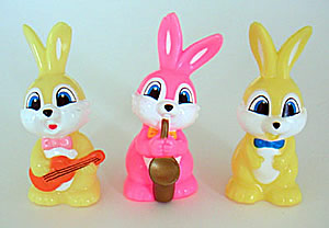 エスエス製薬のキャラクター、ピョンちゃんです。音楽編と言いたいところなのですが、一番右の楽器を持っていないピョンちゃんは同じシリーズでなく単体みたいです。本当はオレンジ色のマイクを持ったバージョンのがシリーズらしいです。友達からもらいました。