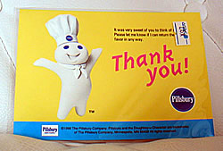 ありがとうハガキです。裏には切手を貼る位置にドウボーイとThe Pillsbury Doughboyの文字がブルーで印刷されてます。Produced by 学研。日本製。97円でした。