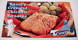アメリカのスーパーなどでPillsburyの製品を売っているセクションに行くとたまに無料のレシピカードが置いてあります。これは冷凍のクロワッサン生地を利用したチキンスクエアのレシピです。裏に作り方や材料が書いてあります。