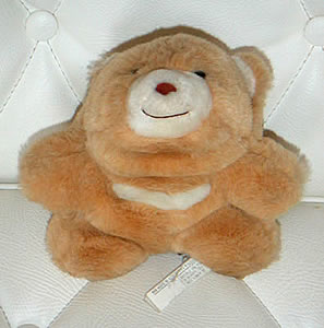 まだ高校生でカナダのトロントに住んでいた頃に、すっごく気に入って買いました。ガンド(GUND)と言うぬいぐるみメーカーのもので名前はSnuffと元からついてます。このクマは他の大きさや色違い(ピンクと白)があります。日本でもたまに売っているのを見かけます。上を向いて笑っている姿が何ともかっわいい!!!かわいがりすぎで、右の脇の下に穴が。。。韓国製。