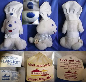 1984年とタグには書いてあるように見えます。アメリカE-bayのオークションで発見。ピルズバリーのキャラクターの中でもペットたちのグッズはほとんど見かける事ができないので、このぬいぐるみはかなり貴重な一品と思われます。しかも写真のフラップジャックは状態もいいですよね。